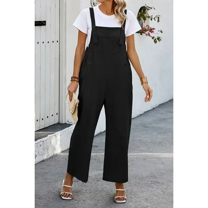 Adam- Solid Square Neck Button Trim Pockets Jumpsuit